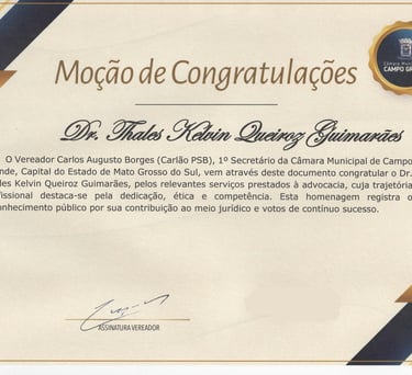 Sua atuação profissional já foi reconhecida pelo Poder Legislativo, destacando sua contribuição à advocacia.